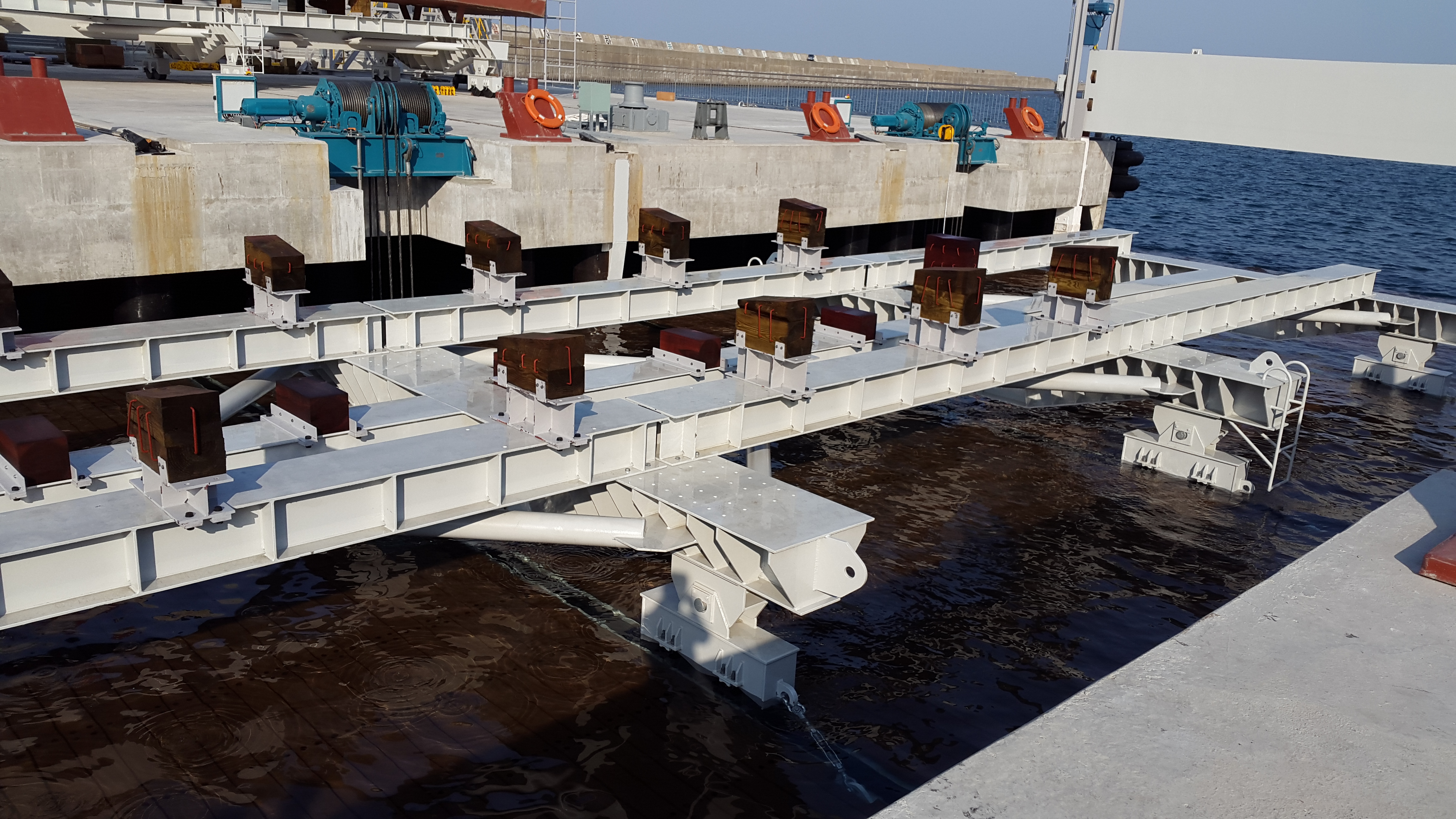 그 다음 선박은 PLATFORM 과 함께 부두 레벨의 높이로 올려지게 되고 TRANSITION RAIL에 의해 지정된 장소로 이동됩니다.